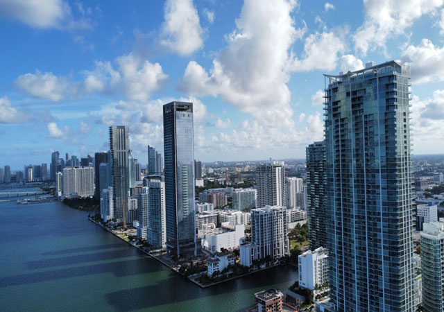 Miami Skyline with waterfront buildings and a far view of the Wynwood Miami area