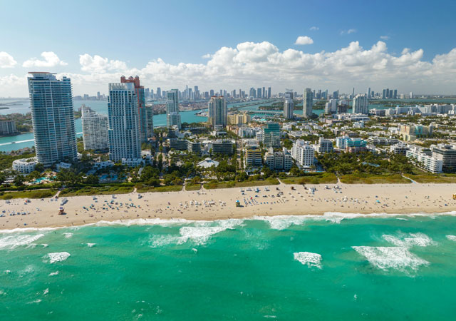 Travel destination in United States. South Beach sandy surface with tourists relaxing on hot Florida sun. Tourism infrastructure in southern USA. Miami Beach city with high luxury hotels and condos